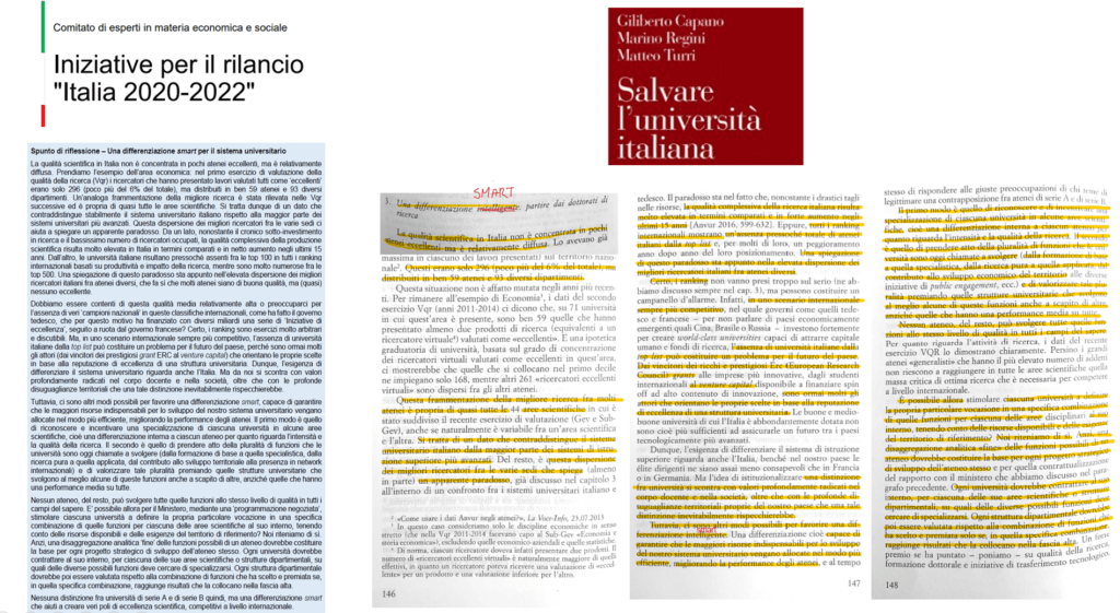 Lo “Spunto di riflessione – Una differenziazione smart per il sistema universitario” contenuto nel Rapporto redatto dal Comitato di esperti in materia economica e sociale è stato ripreso da un libro, intitolato “Salvare l’università italiana“, dei tre autori Giliberto Capano, Matteo Turri e Marino Regini, quest’ultimo parte del comitato di esperti che il Governo ha selezionato per affrontare l’emergenza coronavirus.