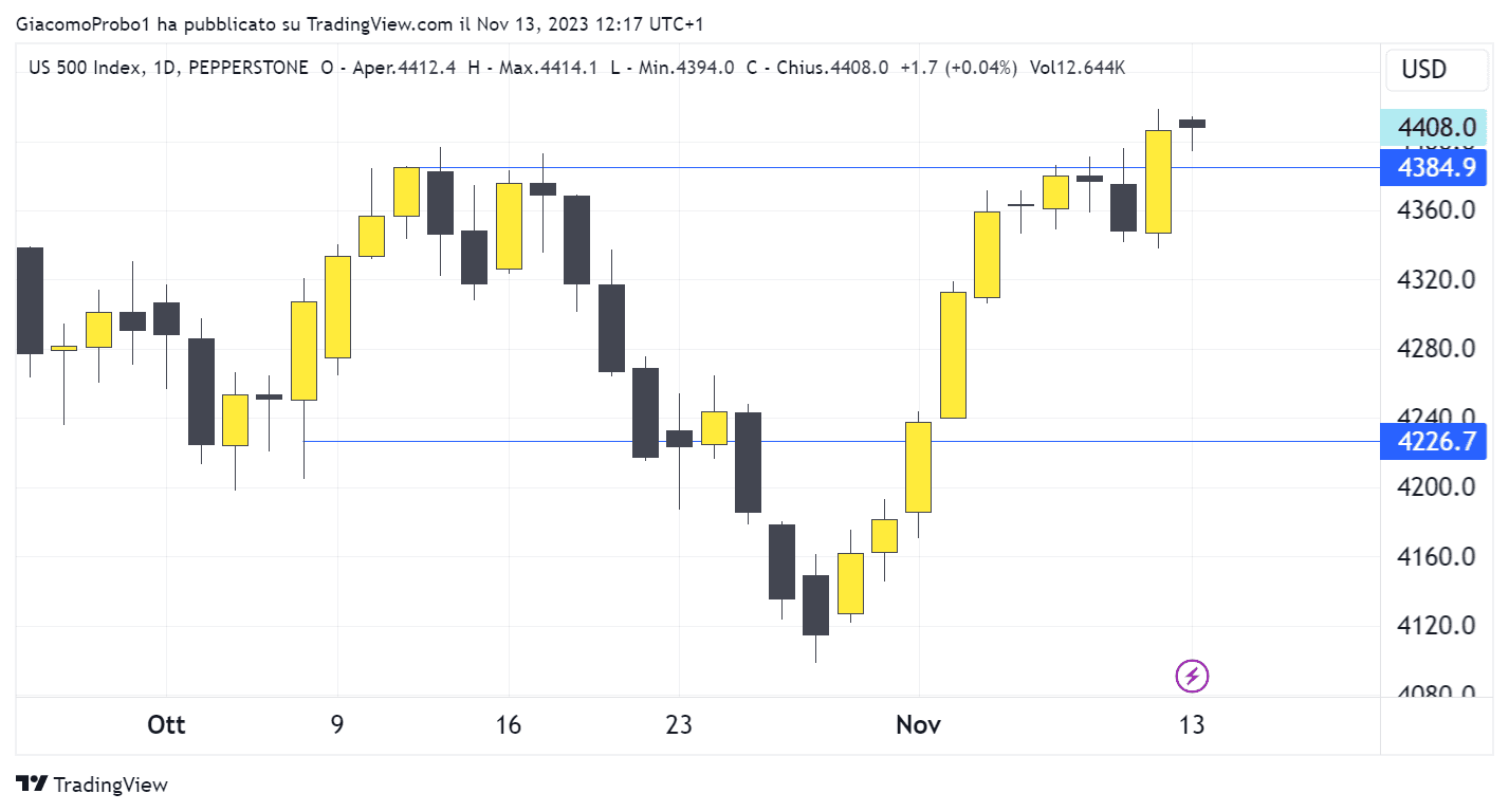 Infatti, le borse Americane ed europee non hanno subito tracolli in questo periodo anzi come evidenziato nel secondo grafico (grafico 2) che indica l’andamento dell’ indice principale in America l’S&P 500 si vede che dal 6 ottobre i prezzi sono leggermente saliti per poi ripiegare ma poi hanno iniziato una salita poderosa portando l’ indice a livelli molto più alti del 6 Ottobre. Infatti, il 6 ottobre l’indice S&P 500 valeva 4226 mentre ora vale 4407.