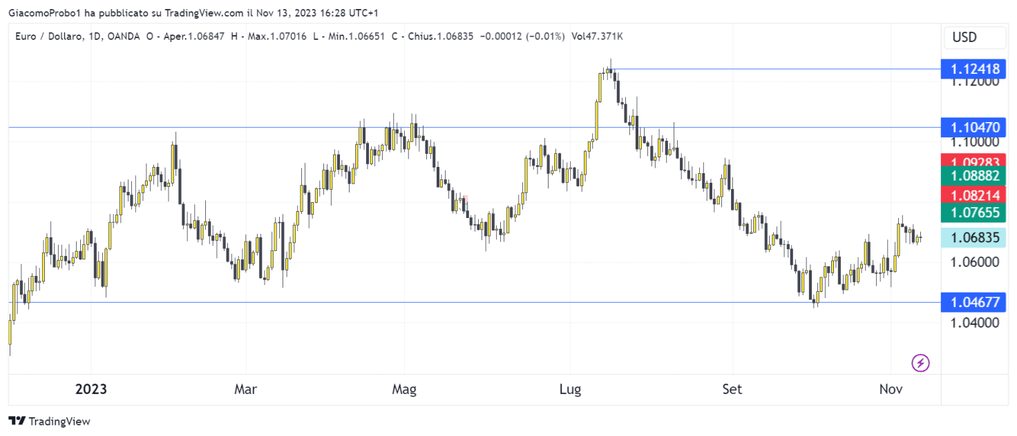 La discesa era iniziata nei primi giorni di luglio e si è interrotta i primi giorni di ottobre a ridosso degli avvenimenti del Medio Oriente ma soprattutto perché in concomitanza ha raggiunto il livello tecnico importante di area 1,046 (grafico 3).