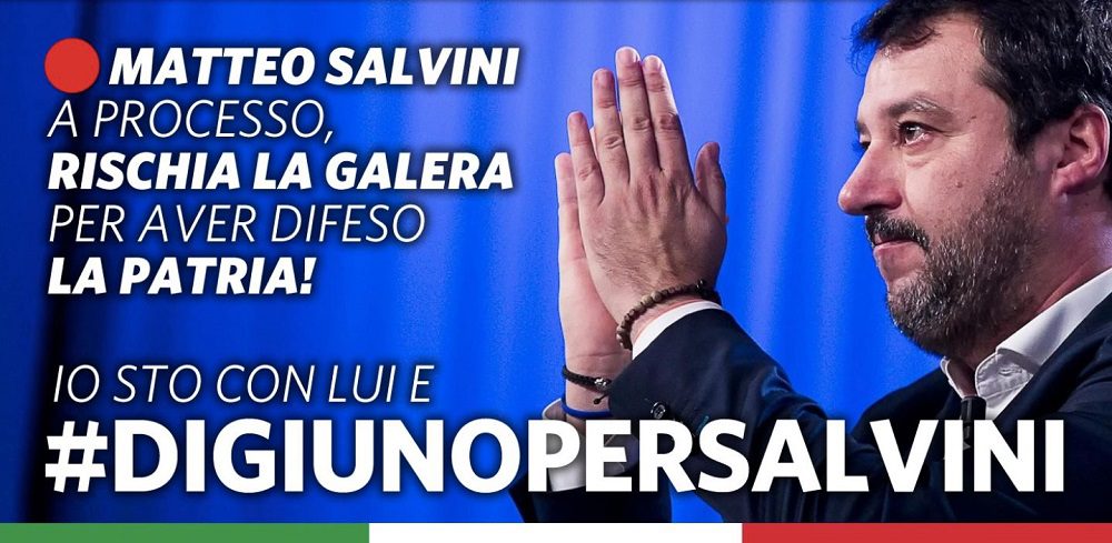 “Matteo Salvini a processo, rischia la galera per aver difeso la patria” si legge sulla home del sito, che invita quindi gli elettori e simpatizzanti leghisti a “digiunare per un giorno “in segno di solidarietà con Matteo Salvini che rischia il processo per il caso Gregoretti”.