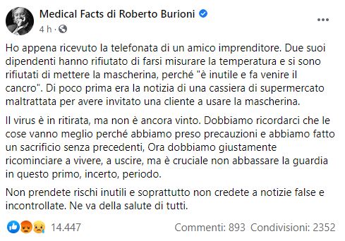 Dello stesso avviso il virologo Roberto Burioni, che su Facebook ha evidenziato il caso di un amico imprenditore e di due suoi dipendenti che “hanno rifiutato di farsi misurare la temperatura e si sono rifiutati di mettere la mascherina, perché “è inutile e fa venire il cancro”. Di poco prima era la notizia di una cassiera di supermercato maltrattata per avere invitato una cliente a usare la mascherina”. Per questo Burioni ricorda che il virus “è in ritirata, ma non è ancora vinto. Non prendete rischi inutili e soprattutto non credete a notizie false e incontrollate. Ne va della salute di tutti”.
