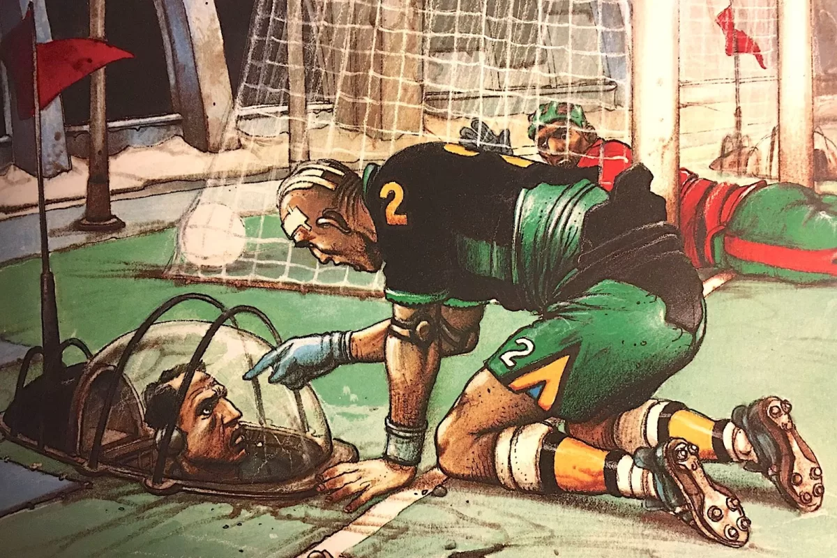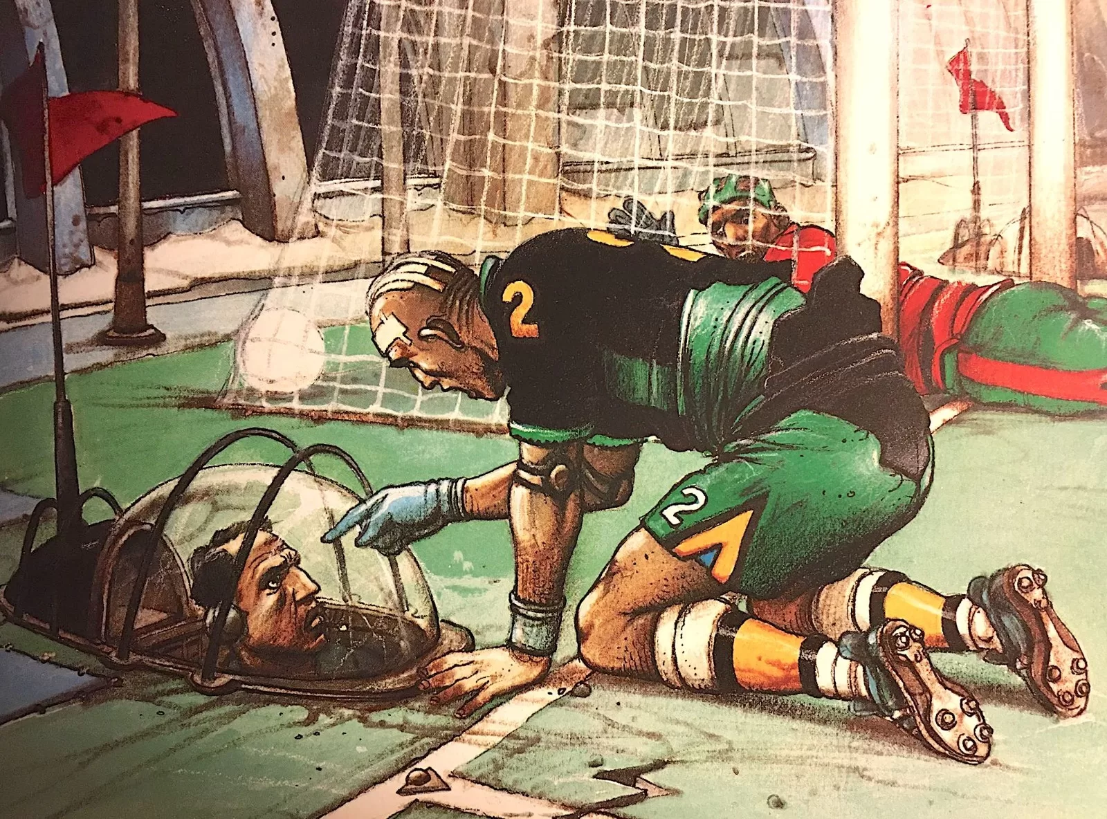 O il calcio diventa uno sport maturo, cioè diventa uno spettacolo dal vivo di appassionato intrattenimento, oppure potrebbe diventare soltanto un gioco senza spalti, senza spettatori dal vivo, senza tifosi, senza palla. In questo senso può essere interessante andare a ripescare dall’oblio il libro a fumetti Fuori Gioco con soggetto e tavole disegnate da Enki Bilal e la sceneggiatura di Patrick Cauvin. In questa storia si parla di un futuro non molto lontano, in cui nell’anno 075 (di una prossima imprecisata era) gli organismi dirigenti decisero di sopprimere il pallone e gli spalti dai campi di calcio. Da quel momento l’entrata di un giocatore col suo corpo dentro la porta avversaria era il gol. Il nome del calcio scomparve e gli androidi cominciarono a giocare con gambe elettroniche e parti umane insieme.