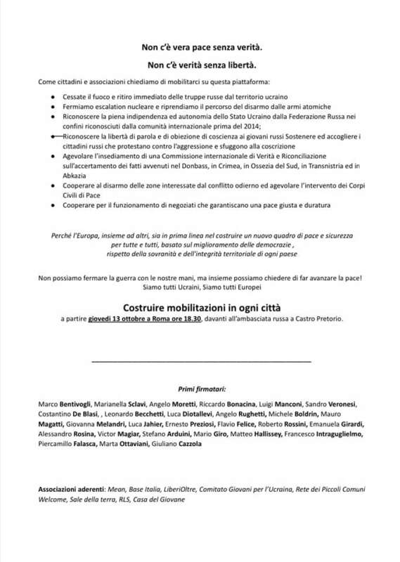 Una manifestazione e una campagna di adesione dal titolo “Non c’è vera pace senza verità. Non c’è verità senza libertà” lanciata da una serie di associazioni e personalità: da Base Italia di Marco Bentivogli a LiberiOltre, dal Comitato Giovani per l’Ucraina a politici ed intellettuali come Sandro Veronesi, Luigi Manconi, Mario Giro, Michele Boldrin, Giulio Cazzola e tanti altri.