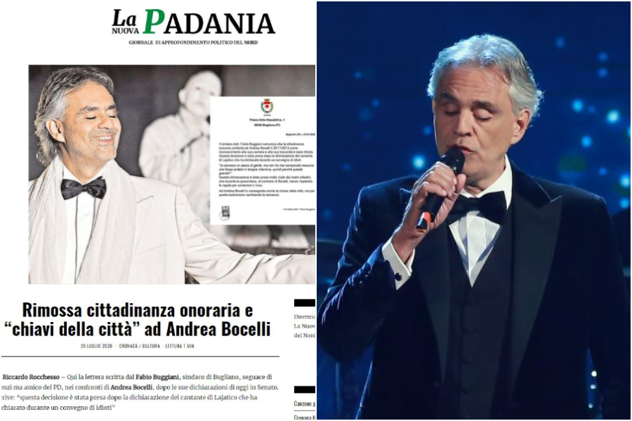 Il giornale online diretto da Stefania Pizzo dedica infatti un articolo, a firma Riccardo Rocchesso, alla decisione del Comune, esistente solo sui social network e ‘guidato’ dal sindaco Fabio Buggiani, di ritirare la cittadinanza onoraria ad Andrea Bocelli, il tenore finito al centro delle polemiche per le sue parole durante un convegno sul Covid-19 al Senato. Bocelli aveva infatti affermato di conoscere “un sacco di gente”, ma “non ho mai conosciuto nessuno che fosse andato in terapia intensiva, quindi perché questa gravità?”.