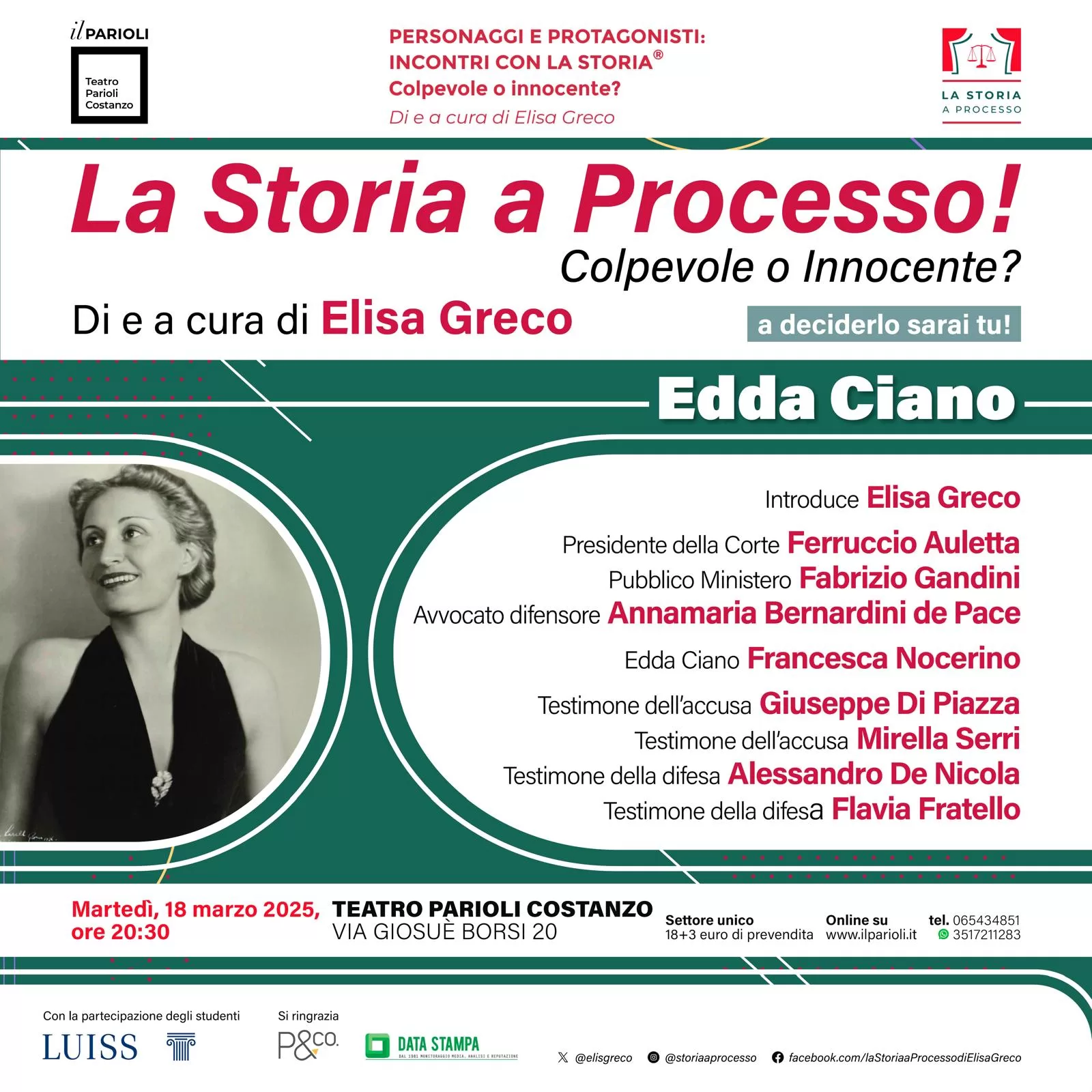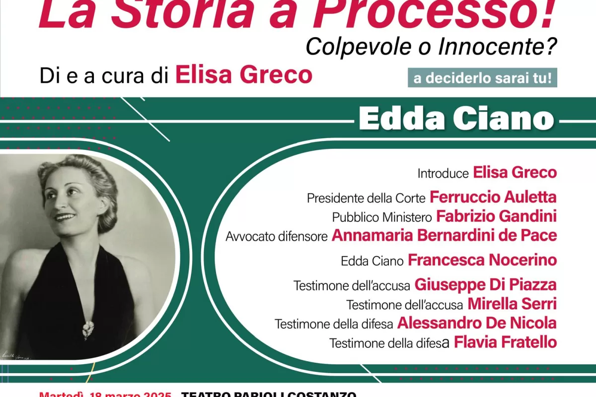 Sale l’attesa per l’atto finale de “La Storia a Processo”, martedì 18 marzo 2025, alle 20:30, che conclude la stagione 2024-25, tra Roma e Milano, con l’appuntamento del Teatro Parioli Costanzo, nella Capitale. Sarà infatti Edda Ciano la protagonista dell’ultimo processo del format ideato da Elisa Greco, che da oltre dieci anni porta a giudizio i personaggi della Storia.