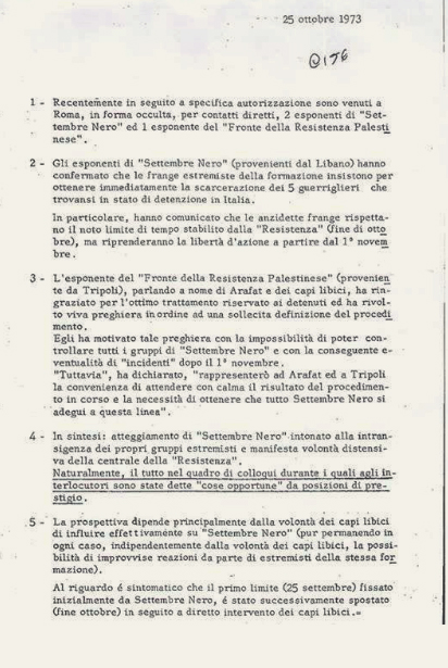 Quattro giorni dopo, il 25 ottobre, una nuova informativa comunicava l’arrivo a Roma di due esponenti di Settembre nero (che era in realtà Al Fatah, il principale gruppo dell’Olp, guidato da Arafat) e uno del Fronte popolare per la liberazione della Palestina, secondo i quali “frange estremiste di Settembre nero” avrebbero rispettato il termine dell’ultimatum fissato al 30 ottobre “ma riprenderanno la libertà d’azione dal primo novembre”. La nota segnalava comunque la volontà distensiva della leadership nei confronti delle aree più battagliere e aggiungeva un passaggio molto significativo, e infatti evidenziato dagli estensori del testo per la sua importanza: “Naturalmente il tutto nel quadro di colloqui durante i quali agli interlocutori sono state dette ‘cose opportune’ da posizioni di prestigio”. Formula nemmeno velata per sottolineare che ai rappresentanti dell’Olp erano state fatte precise promesse in cambio della loro opera di distensione. Nella stessa giornata del 25 ottobre un vertice tra esponenti dei ministeri degli Esteri e degli Interni e del Sid alla Farnesina affrontò direttamente il caso.