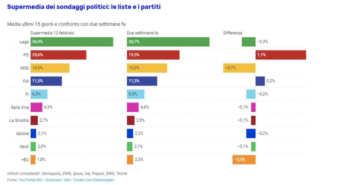 COME CAMBIANO LE INTENZIONI DI VOTO – Entrando nel dettaglio della Supermedia, il Carroccio cala ancora dello 0,3% e scende al 30,4%. La distanza col Partito Democratico si accorcia leggermente, con il partito di Zingaretti che guadagna in 15 giorni un punto salendo sopra quota venti (20,6%). Il Movimento 5 Stelle si conferma in caduta libera, viene stimato al 14,3% e perde lo 0,7%. I grillini vengono avvicinati da Fratelli d’Italia che salgono fino all’11,5% (+0,2%) e sono distanti ormai meno di tre punti.
