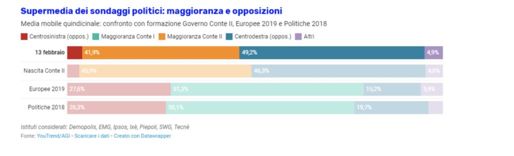 LE COALIZIONI – Lo scarto tra il fronte dei partiti di governo e l’opposizione supera gli 8 punti: Pd, M5S, Leu e Italia Viva si fermano infatti al 41,9%, quattro punti in meno rispetto alla nascita del governo Conte bis, mentre l’opposizione di centrodestra sfiora la maggioranza assoluta e viene stimata al 49,2%.