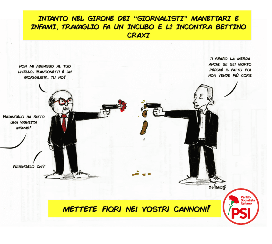 «Le idee di Sansonetti sono storicamente anticraxiane. E nonostante ciò – prosegue il segretario del Psi – si è opposto, in solitudine, a un fatto gravissimo e offensivo di tutta la comunità socialista e della famiglia di Bettino Craxi. Si chiama giornalismo». Maraio, pubblicando una vignetta di risposta del Psi, ha aggiunto: «Se Craxi avesse visto la vignetta, anzichè abbassarsi al loro livello, avrebbe risposto con gli strumenti e i simboli della libertà: con un garofano rosso puntato in una pistola. Nonostante la merda sparata da Travaglio, soltanto per provare a vendere più copie», ha concluso.