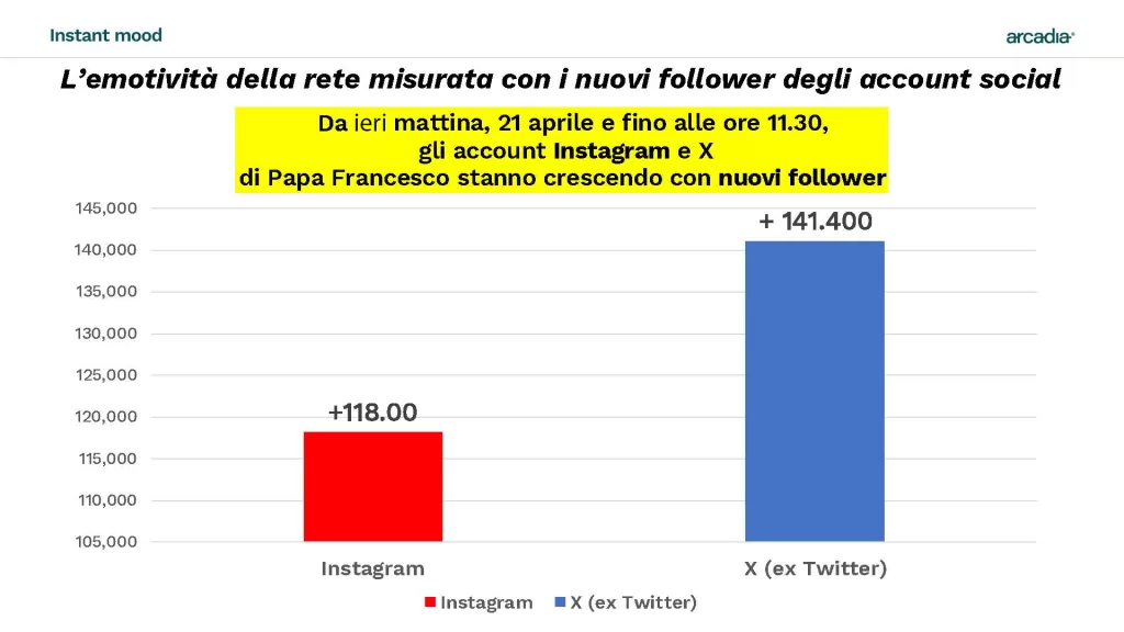 Allo stesso modo anche gli account social del Pontefice (quelli su X, a proposito, hanno già cambiato il nome in Apostolica Sede Vacans) hanno incrementato i propri follower per tutta la giornata di ieri. Infatti, l’account su Instagram è cresciuto con ben 118 mila nuovi follower, mentre quelli su X, complessivamente, di altri 140 mila.