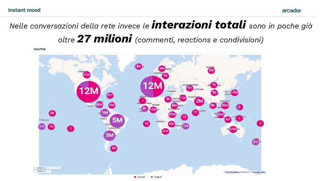 I dati raccolti dalle piattaforme di monitoraggio segnano numeri davvero importanti. Le interazioni complessive della parola chiave “papa”, in italiano e in inglese, solo nella giornata di ieri hanno raggiunto la cifra record di oltre 28 milioni, mentre i paesi dove si sono registrate le maggiori ricerche degli utenti sono, da un lato, quelli dell’America Latina, l’Argentina, il Brasile, il Paraguay e la Colombia, dove Bergoglio è sempre stato amatissimo dai fedeli e non solo. Dall’altro, invece, ci sono le nazioni europee, con in testa l’Italia, poi la Spagna e la Francia. Ma anche nel resto del mondo non è mancata una grande ondata di partecipazione popolare, tant’è che, tra i paesi dove le conversazioni si sono polarizzate maggiormente, ci sono anche Australia, Regno Unito, Stati Uniti e Indonesia.