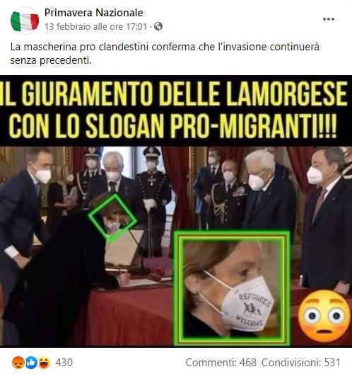 La macchina della propaganda dell’estrema destra italiana non si ferma neanche durante i momenti del giuramento dei nuovi ministri del governo Draghi. Ne sa qualcosa Luciana Lamorgese, ministro dell’Interno del governo Conte-bis e confermata dall’ex numero uno della Banca centrale europea al Viminale come “tecnico”.