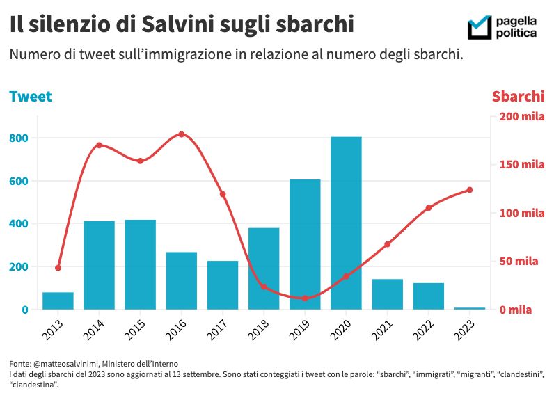 Salvini che nelle ultime ore ha alimentato complottismi evocando un ‘piano‘ e un ‘atto di guerra‘ contro l’Italia, dopo la decisione di Francia e Germania di non collaborare perché il nostro Paese non rispetta la convenzione di Dublino, negli ultimi tempi come ha cambiato la sua comunicazione sui migranti? Stando ai dati raccolti da Pagella Politica che ha confrontato l’impennata di sbarchi negli ultimi anni con i tweet del leader leghista (conteggiando le parole “sbarchi”, “immigrati”, “migranti”, “clandestini”, “clandestina”), il numero di cinguettii dell’ex ministro dell’Interno è sensibilmente calato nel 2021 e 2022, e quasi del tutto sparito nel 2023. Praticamente nell’ultimo anno, che come detto da gennaio ha fatto registrare 123mila sbarchi in nove mesi, Salvini tace sulla questione, arrivando nelle scorse ore a evocare “atti di guerra “contro l’Italia per provare a respingere i dati agghiaccianti frutto delle politiche sbagliate dell’esecutivo di cui fa parte. Grafico analogo anche per la stessa Meloni, così come rileva Pagella Politica.