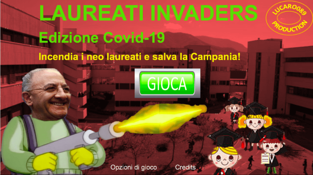 L’idea è stata di Lucaro089. E per giocare basta accedere a questo link dal quale comparirà una schermata da videogioco anni ’90. Il gioco è stato battezzato Laureati Invaders – Edizione Covid-19 Incendia i neo laureati e salva la Campania.