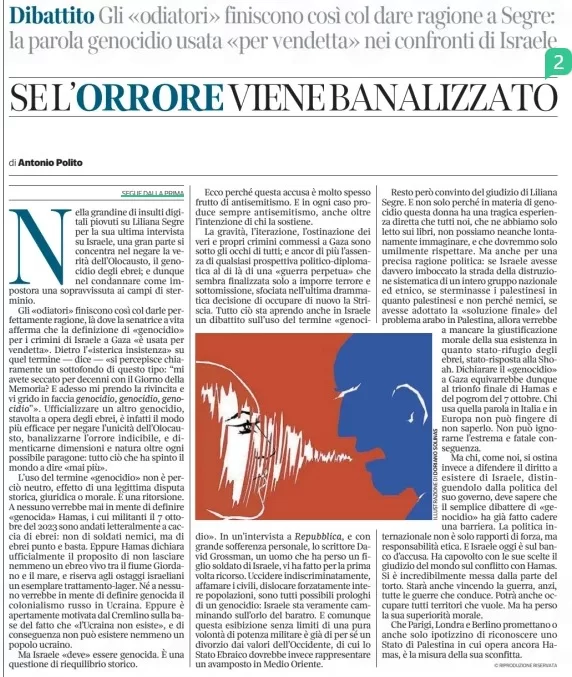 Era sicuramente molto benintenzionato l’articolo con cui Antonio Polito, sul Corriere della Sera di ieri, denunciava l’inciviltà antisemita che si è riversata su Liliana Segre solo perché questa anziana signora, una sopravvissuta di Auschwitz, ha osato rammaricarsi per l’uso odioso che si fa ormai comunemente della parola “genocidio”. Un termine adoperato con l’effetto, quando non con l’intenzione, di rinfacciare agli ebrei – sotto il paludamento della “critica a Israele” – la commissione del delitto incancellabile. Non senza, pressoché sempre, l’inconfessabile ma vibrante desiderio negazionista rivolto a rintuzzare la lagna ebraica che adibisce la Shoah a scudo protettivo che permette di perpetrare impunemente ogni sorta di atrocità.