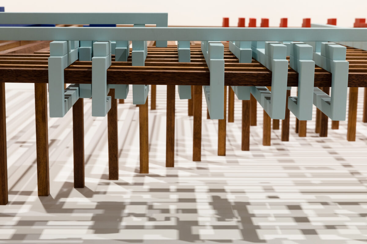 Sempre lavorando con l’archivio di Silvia Federici, nella scultura Bench and Table Sixteen Conversations on Abstraction (2021) Riet Wijnen costruisce un dialogo aperto tra i documenti dell’archivio e il pubblico. L’opera nasce per una commissione pubblica nella città olandese di Leida e si trasforma per la mostra milanese con l’aggiunta da parte dell’artista di un piano di appoggio mobile su misura per ospitare il materiale d’archivio. L’opera diviene quindi allo stesso tempo un tavolo espositivo ed un contenitore, invitando lo spettatore a partecipare alla formazione di un pensiero critico soggettivo. Superando la fruizione istituzionale dell’archivio stesso, mediante un processo pedagogico inedito, Wijnen riattualizza urgenze e questioni socio-culturali riposizionandole nella complessità del presente.
