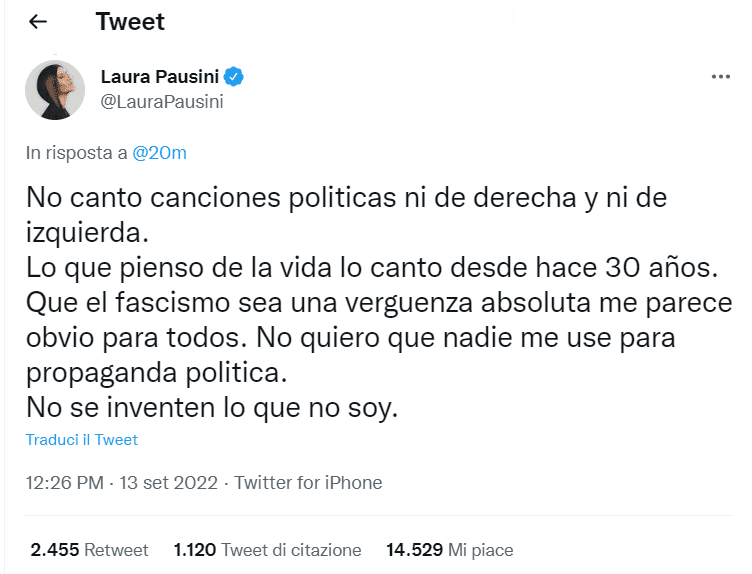A difesa della cantante sono intervenuti i suoi fan. Pausini stessa è tornata sul punto con un post sui social: “Non canto canzoni politiche ne di destra ne di sinistra. Quello che penso della vita lo canto da trent’anni. Che il fascismo sia una vergogna assoluta mi sembra ovvio per tutti. Non voglio che nessuno mi usi per fare propaganda politica. Non si inventino quello che non sono”.