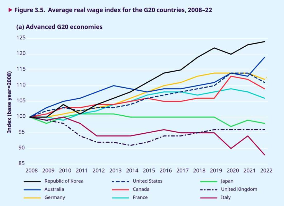 Il dato emerge nel Rapporto mondiale sui salari 2022/23 “L’impatto dell’inflazione e del Covid-19 sui salari e sul potere d’acquisto“. A fare compagnia all’Italia in questa ‘speciale classifica’ sono Giappone e Regno Unito, le uniche altre due economie del G20 dove i salari reali nel 2022 hanno fatto registrare livelli inferiori al 2008. Il Belpaese in questo fa la parte del leone: il Giappone cala infatti ‘solo’ del 2 per cento, mentre il Regno Unito del quattro. All’altro estremo Australia e Corea del Sud, che mostra invece una crescita dei salari in forte aumento.