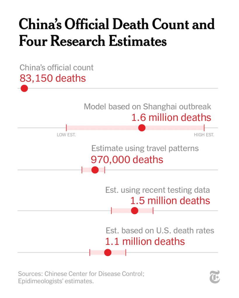 After China ended “zero Covid,” the world’s most stringent Covid-19 restrictions, the virus exploded. Rough estimates from four separate academic teams suggest that between 1 and 1.5 million people died — far more than the official count. https://t.co/JvnzQYOzUS