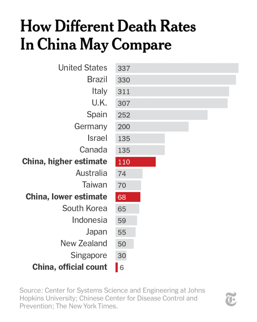 A questo enorme numero va aggiunto un enorme disclaimer: da un lato l’inattendibilità dei dati ufficiali forniti dal regime di Pechino, dall’altro che nel conto dei morti per Covid-19 in Cina non sono inclusi i pazienti deceduti in casa, ma solo quelli passati attraverso gli ospedali, dove ai medici viene “sconsigliato” di riportare il Sars-Cov-2 come causa di decesso.