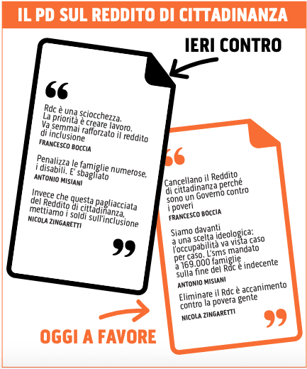 Antonio Misiani, oggi responsabile economico della segreteria Dem, era impietoso: «Il reddito di cittadinanza penalizza le famiglie con disabili e anche quelle numerose, dove è maggiore il tasso di povertà». Anche l’ex segretario del PD Zingaretti è stato tra i critici del reddito di cittadinanza.