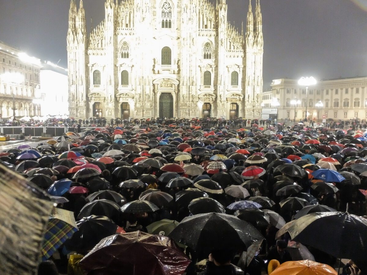 Inizialmente le Sardine “del Naviglio” avrebbero dovuto “nuotare” nella più piccola piazza del Mercanti, ma i tanti messaggi di adesione – circa 10 mila – arrivati sulla pagina Facebook del movimento hanno spinto gli organizzatori, a mezz’ora dall’inizio della mobilitazione, a spostare il tutto nella più ampia piazza Duomo, che si è riempita di ombrelli, cartelli con sardine stilizzate e colorate e striscioni.