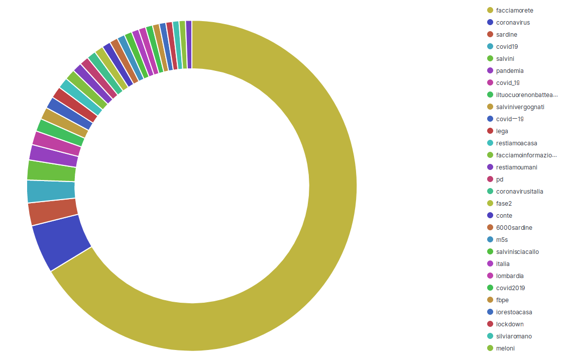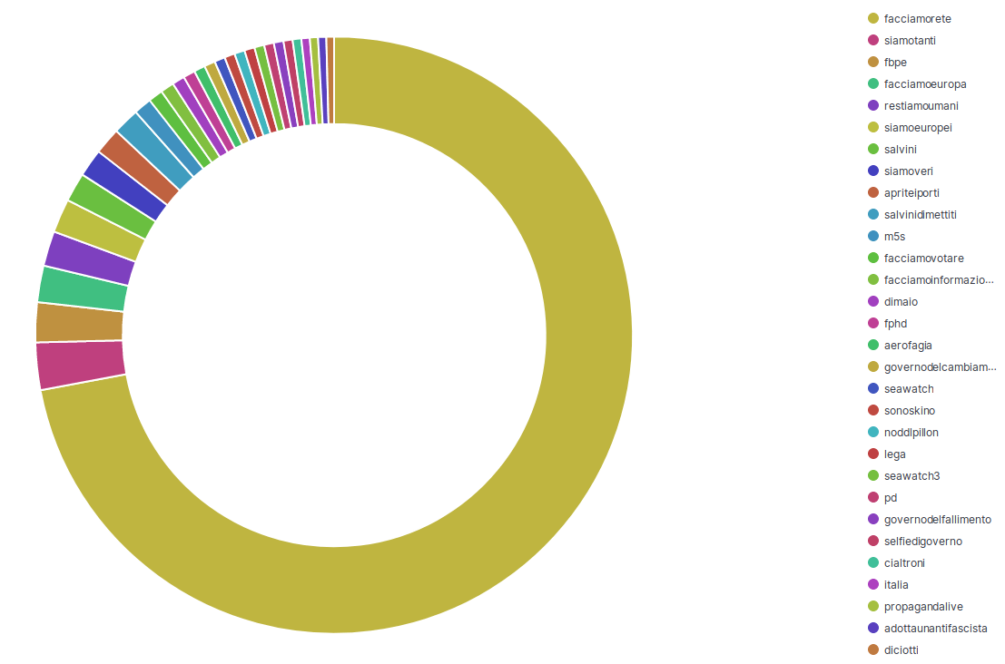 Precisiamolo, i numeri restano sempre importanti per un movimento che esprime una grande parte di consenso nel social del cinguettio, ma è giusto evidenziare il forte calo avuto dovuto a diversi fattori storici che hanno sancito il disinteresse della massa e la dispersione del consenso stesso. Non è un caso che la rovina del collettivo è stato quello di accodarsi alle Sardine che ne hanno cannibalizzato il pensiero per fini elettorali in Emilia Romagna per poi dileguarsi. C’è un altro fattore da non sottovalutare che invece rappresenta il fulcro dell’anima del movimento. Nel 2019 al potere c’era Matteo Salvini come Ministro dell’Interno della Repubblica Italiana, famoso per i suoi decreti “razzisti” che tutt’oggi sono in vigore, poi c’è stata la vicenda del Papeete che ha fatto riscaldare gli animi insieme al caso Carola Rackete. Tanto materiale per chi armeggia tastiera, ironia e militanza per esprimere il proprio pensiero. A confermare questa tesi c’è il grafico degli hashtag associati a facciamorete nel 2019.