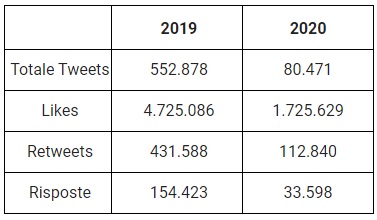 Entrando nel merito del trend in caduta libera basta dare un’occhiata al numero di tweets ricavati dal 1 gennaio al 26 agosto 2019 ed allo stesso periodo del 2020: