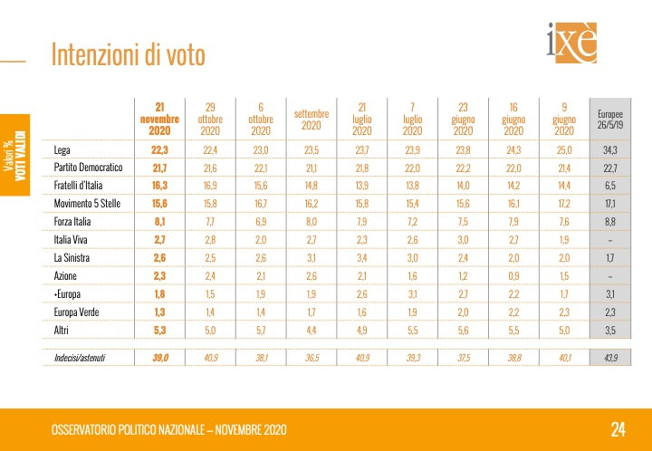 Alle loro spalle brusco calo dopo mesi di crescita per Fratelli d’Italia: il partito di Giorgia Meloni passa dal 16,9 per cento al 16,3%, ma non ne approfitta il Movimento 5 Stelle che si attestano al 15,6% (-0,2%).