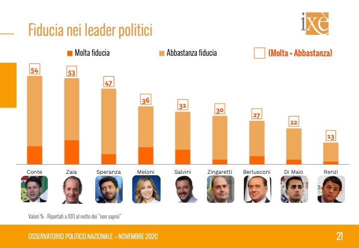 LA FIDUCIA NEI LEADER – Il presidente del Consiglio Giuseppe Conte resta stabile in testa, tallonato però dal governatore veneto Luca Zaia, mentre sul terzo gradino del podio c’è il ministro della Salute Roberto Speranza Dietro Giorgia Meloni si conferma davanti a Matteo Salvini, a sua volta davanti a Zingaretti, Berlusconi, Di Maio e Renzi.