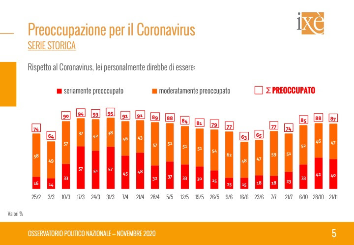 LA PREOCCUPAZIONE PER IL COVID – La preoccupazione per la pandemia si mantiene su livelli elevati. Al 21 novembre novembre l’87% degli italiani si dice preoccupato: di questi il 40% è “seriamente preoccupato” rispetto al Coronavirus, in calo di due puti rispetto allo scorso mese.