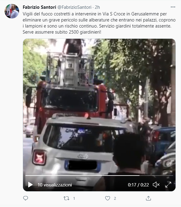 Incuria delle zone verdi di Roma. La denuncia parte da Fabrizio Santori, dirigente regionale della Lega, che oggi ha pubblicato un video sul suo profilo Twitter denunciando l’intervento dei Vigili del Fuoco in Via Santa Croce in Gerusalemme, questa mattina alle 9.30, per tagliare un ramo pericoloso che si stava per spezzare e cadere in strada.