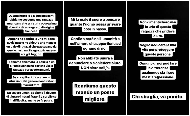 È successo tutto intorno alle 4 di mattina, mentre il giovane cantante si trovava nel quartiere di Portonaccio a Roma. Stava tornando a casa da una serata in un locale quando ha sentito una donna gridare. L’ha vista divincolarsi dalle braccia di un uomo tra le automobili parcheggiate. “Questa notte io e alcuni passanti abbiamo prestato aiuto a una ragazza americana che era stata poco prima abusata da un giovane di origine francese. Appena ho sentito le urla mi sono avvicinato e ho chiesto una mano a un paio di ragazzi che passavano da quelle parti, ma il francese era già fuggito”. Gassman ha quindi chiamato la polizia e un’ambulanza che ha portato via la ragazza per accertamenti.