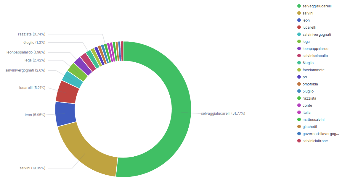 L’argomento più indicato nei tweets è stato selvaggialucarelli, ma basta poco per capire l’impatto mediatico di questa notizia con un 20 per cento nella top20 occupato da Salvini, che è estraneo da questa vicenda se non per la contestazione ricevuta e la reazione pacata avuta nei confronti di Leon Pappalardo. Al terzo posto figura l’autore della contestazione, ed altre declinazioni semantiche di madre e figlio, per poi dare spazio agli hashtags che accompagnano polemicamente e quotidianamente il leader della Lega su twitter: #salvinivergognati, #salvinisciacallo, razzista, omofobia e salvinicialtrone.
