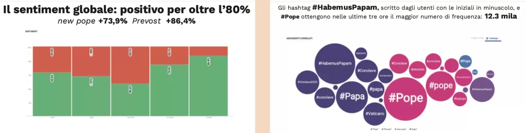 Il sentiment globale è positivo per oltre l’80%; new pope +73,9%; Prevost +86,4%. Tra le 25 emoji più utilizzate dagli utenti online per commentare l’elezione del nuovo Pontefice, figurano le mani congiunte in preghiera, il lampeggiante della breaking news e le bandiere dello Stato Pontificio e degli Stati Uniti.