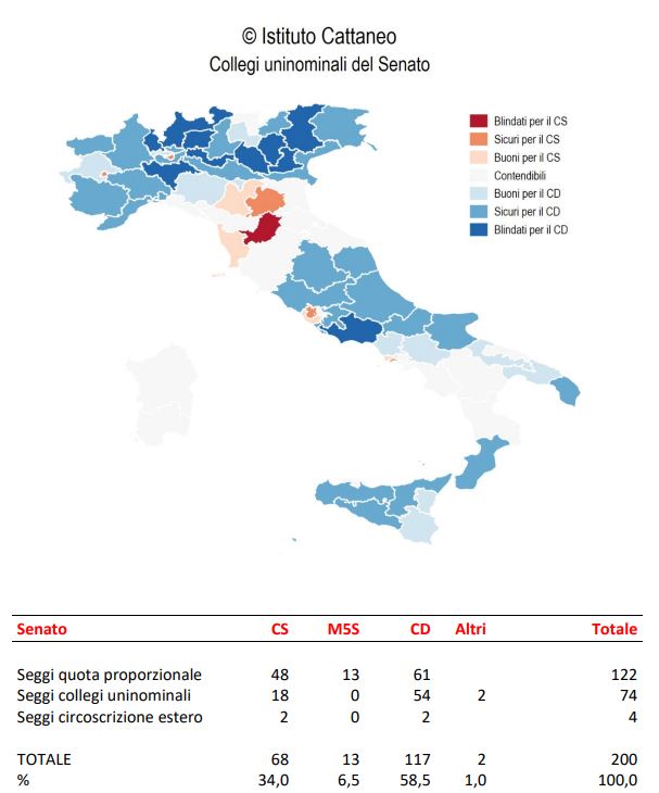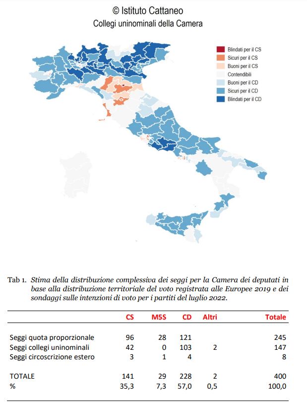 Risultati? Per il Cattaneo il centrosinistra allargato di Letta senza i 5 Stelle potrebbe considerare ‘blindati’ solamente alcuni collegi nella storica ‘zona rossa’ a cavallo tra Emilia Romagna e la Toscana, giocandosela col centrodestra del trio Meloni-Salvini-Berlusconi nelle grandi città come Milano, Roma, Napoli, Torino e Genova. Insomma, stando agli attuali sondaggi e alle proiezioni ‘territoriali’ dell’Istituto la coalizione formata da Fratelli d’Italia, Lega e Forza Italia potrebbe godere di una maggioranza solida e assoluta sia alla Camera e al Senato.