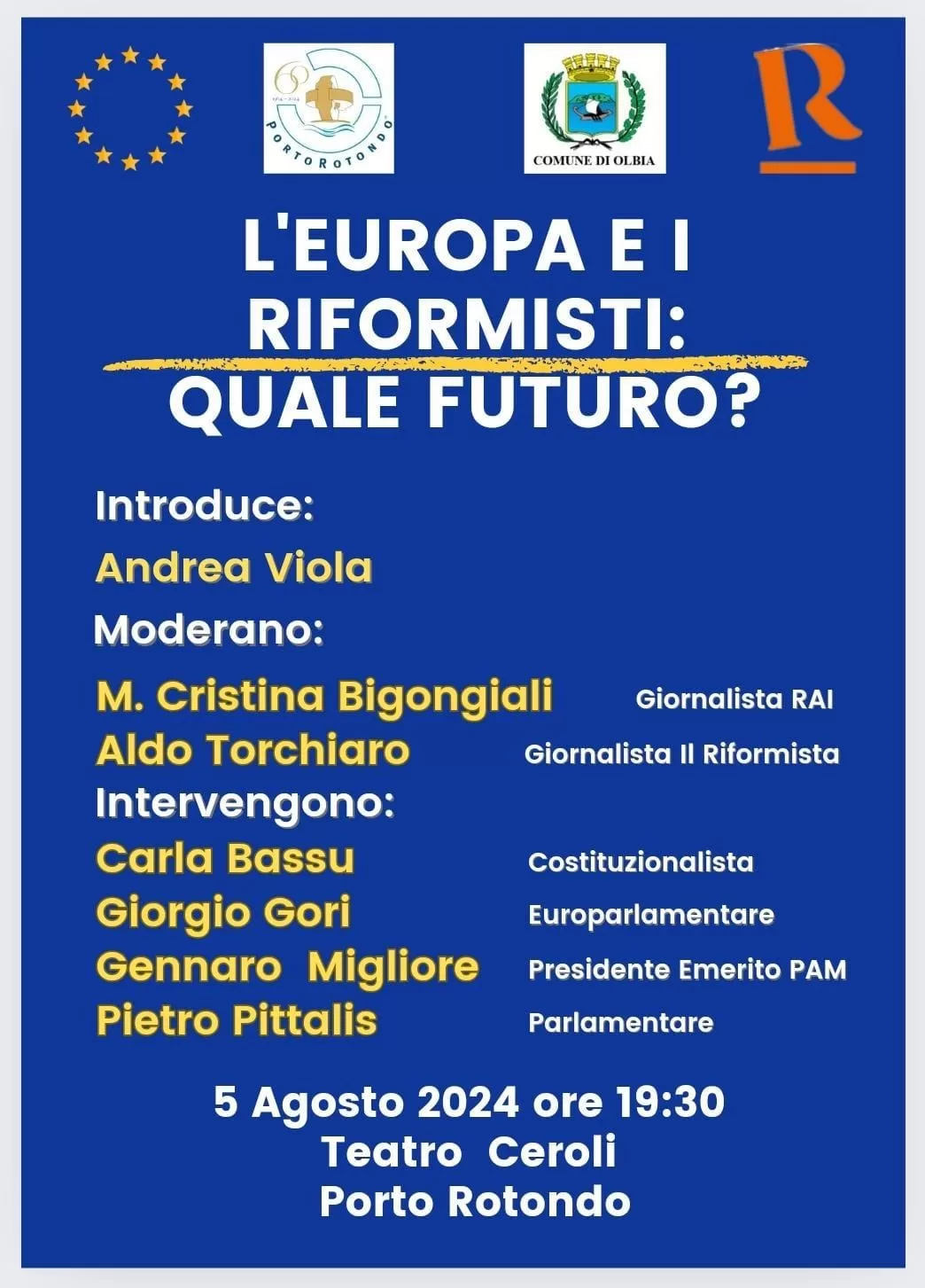 Un appuntamento politico-culturale da non perdere. Il primo di un ciclo che si ripeterà ogni anno e che inizia sotto la stella del 60° compleanno dalla nascita del meraviglioso Borgo di Porto Rotondo. Meta sempre più legata alla cultura e all’arte. La sera del 5 Agosto, nella splendida cornice del Teatro Ceroli, si discuterà dell’Europa, dei Riformisti e del loro futuro. A seguito delle Elezioni Europee (e di quelle politiche in Inghilterra e Francia) un’occasione per analizzare i risvolti socio economici che caratterizzeranno il prossimo futuro.