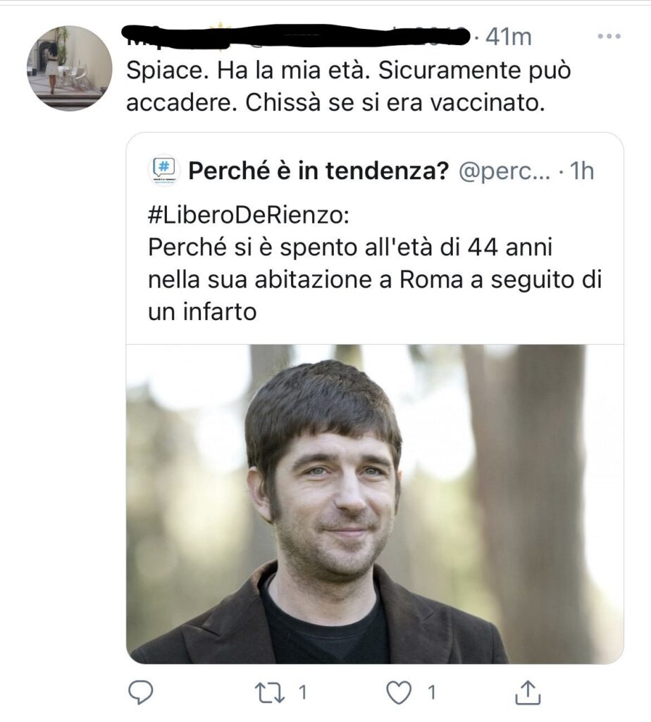 Una notizia arrivata soltanto in mattinata ma già sfruttata dall’universo no-vax del web per fare allusioni, lanciare ipotesi su una presunta correlazione tra la morte di Libero De Rienzo e il vaccino anti Covid. Al momento, è bene chiarirlo, l’unica cosa nota sul tragico decesso dell’attore 44enne, vincitore di un David di Donatello nel 2002 per la sua interpretazione da attore non protagonista per ‘Santa Maradona’, ma protagonista anche di altri celebri film come ‘Fortapàsc’ e la serie ‘Smetto quando voglio‘, è che l’attore è stato trovato privo di vita in casa, senza alcun segno di violenza.