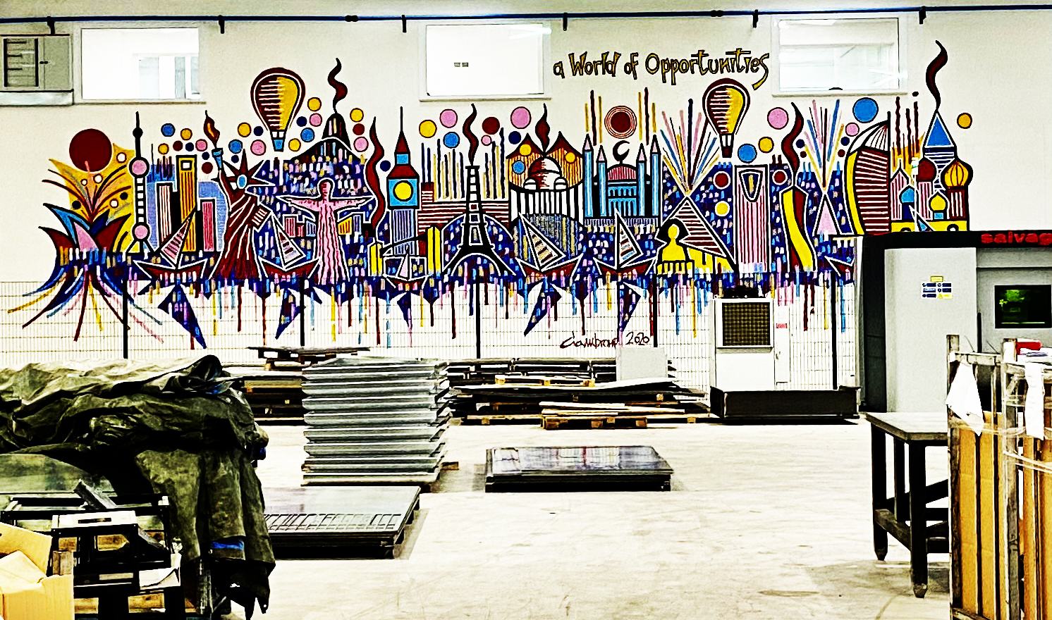 Un’intera parete di una fabbrica trasformata in affresco. Un’opera di 50metri ispirata alle città simbolo dei 12 paesi con cui la Coelmo spa di Acerra ha le principali relazioni commerciali: Sydney, Shanghai, New York, Rio de Janeiro, Londra, Parigi, Napoli, Istanbul, Cairo, Riyadh, Dubai, Mosca. Il gigantesco murale, dal titolo A World of Opportunities, realizzato da Alessandro Ciambrone, architetto, ricercatore e writer di Castel Volturno, campeggia nel nuovo terzo stabilimento produttivo della fabbrica che dal 1947, a nord di Napoli, progetta e produce Gruppi Elettrogeni Industriali e Marini.