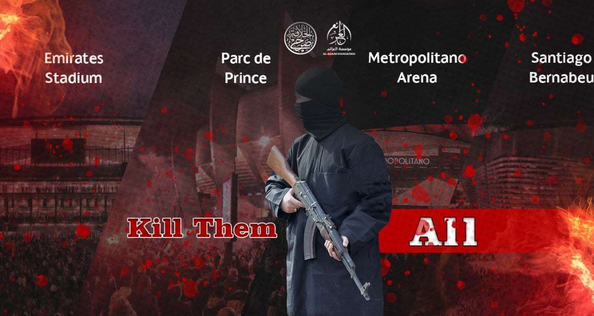 Diffusa un’immagine che mostra quattro stadi – due a Madrid, il Santiago Bernabéu e il Metropolitano, che ospiteranno rispettivamente Real Madrid-Manchester City e Atletico Madrid-Borussia Dortmund, il Parc des Princes a Parigi per PSG-Barcellona e l’Emirates Stadium a Londra per Arsenal-Bayern – con la scritta “Uccideteli tutti”.