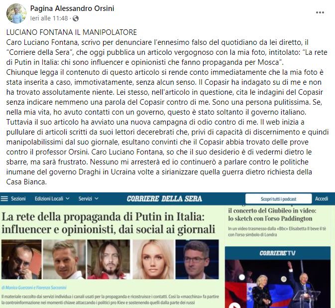 Proprio quest’ultimo ha annunciato che farà causa per diffamazione al quotidiano dopo gli articoli a firma Fiorenza Sarzanini e Monica Guerzoni. Rivolgendosi al direttore Luciano Fontana, il professore di sociologia del terrorismo sottolinea che “chiunque legga il contenuto di questo articolo si rende conto immediatamente che la mia foto è stata inserita a caso, immotivatamente, senza alcun senso. Il Copasir ha indagato su di me e non ha trovato assolutamente niente. Caro Luciano Fontana, so che il suo desiderio è di vedermi dietro le sbarre, ma sarà frustrato. Nessuno mi arresterà ed io continuerò a parlare contro le politiche inumane del governo Draghi in Ucraina volte a sirianizzare quella guerra dietro richiesta della Casa Bianca”.