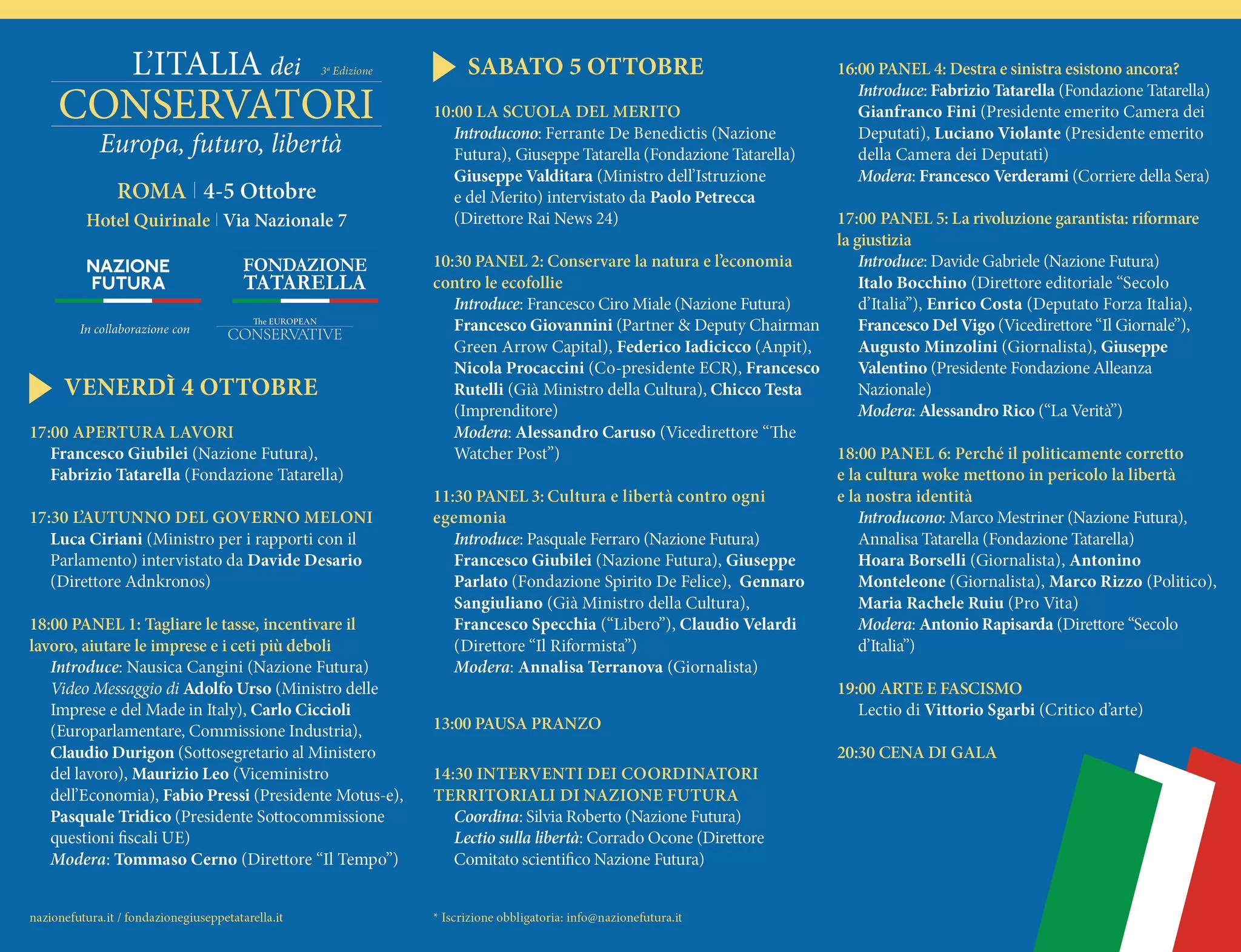 Ministri, parlamentari, giornalisti, scrittori, imprenditori si incontrano a Roma per partecipare alla manifestazione “L’Italia dei conservatori” organizzata da Nazione Futura e dalla Fondazione Tatarella (in collaborazione con “The European Conservative) questo venerdì e sabato 4-5 ottobre all’Hotel Quirinale in Via Nazionale 7.