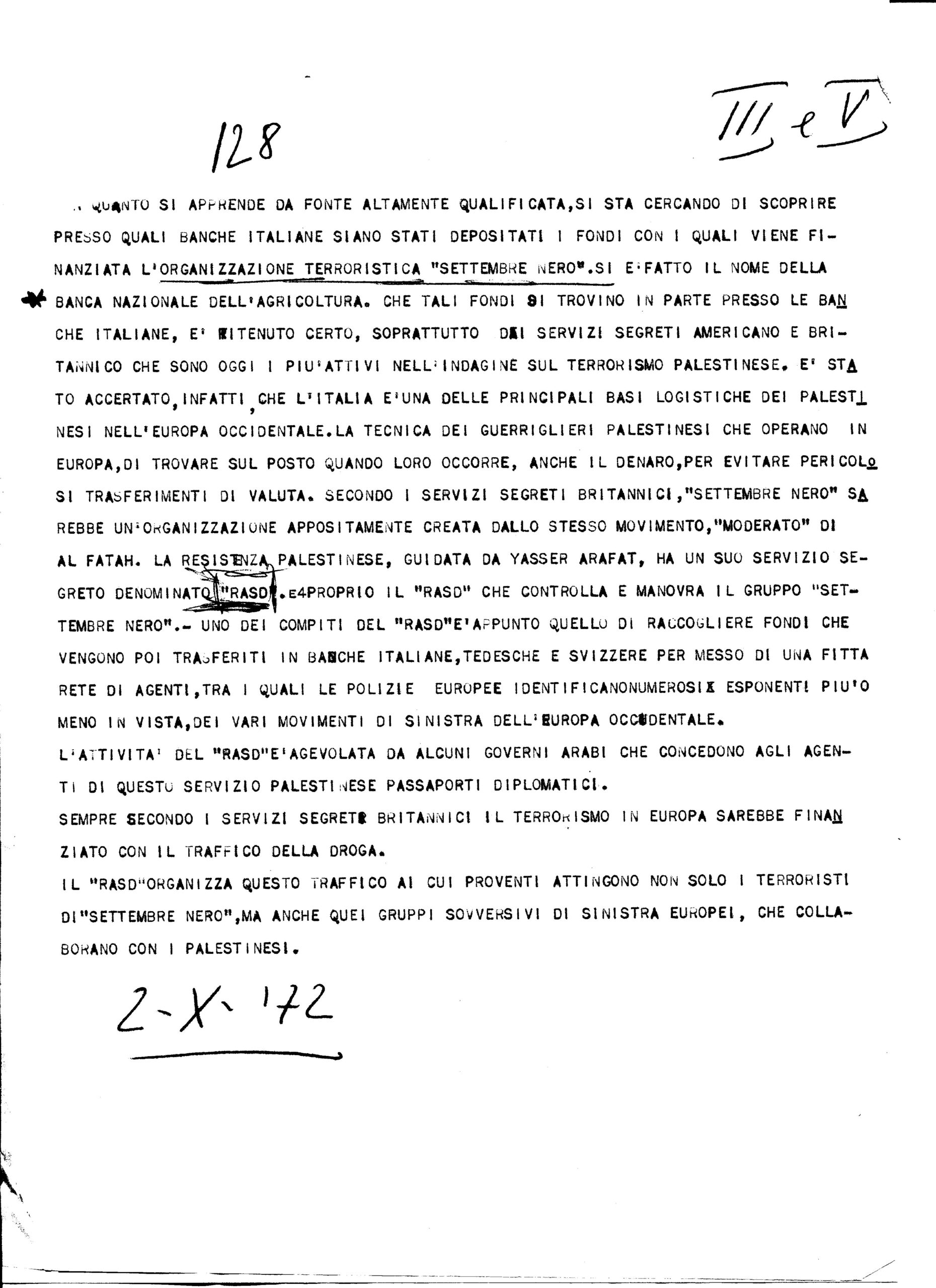 Nella trasformazione dell’Italia in centrale operativa i soldi erano importanti tanto quanto le armi. Dal documento che qui pubblichiamo, emerge chiaramente la rete di finanziamenti costruita in Italia. Secondo quanto riportato dai servizi segreti americani e inglesi l’Italia era una delle principali basi logistiche dei palestinesi nell’Europa Occidentale. Il denaro depositato serviva per gli attentati e trovandosi già in loco non dava adito a pericolosi trasferimenti di valuta, che avrebbero potuto mettere in allarme le forze dell’ordine. A occuparsi di questo aspetto delle attività dell’Olp era il Rasd. Significa “rete di osservazione” e, secondo la documentazione dell’Ufficio Affari Riservati risalente al marzo del 1972, il Rasd era in effetti l’organo informativo di Al Fatah, creato per raccogliere informazioni su Israele, poi anche sui territori persi durante la guerra del giugno del 1967 e infine per reclutare nuovi membri di Al Fatah. Il primo direttore fu Salah Khalaf (Abu Iyad), numero due di Al Fatah, addestrato al Cairo dal Servizio Informativo Egiziano (Sie) insieme ad Alì Hasan Salamah (Abu Hasan), destinato a succedergli nella carica. Il sodalizio iniziale vide i due servizi operare insieme, entrando in disaccordo solo ai primi degli anni 70.
