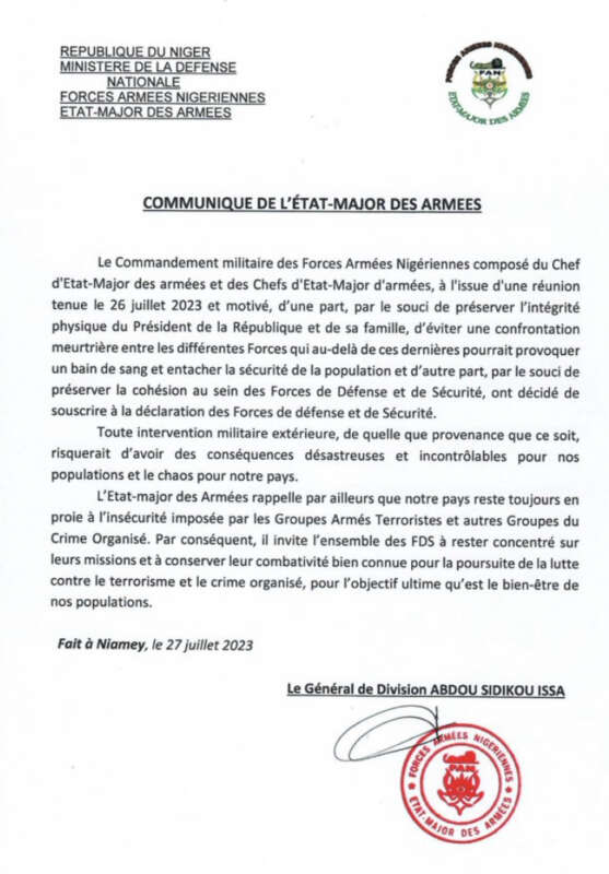 Il capo di stato maggiore, generale Abdou Sidikou Issa, a nome dell’esercito del Niger ha deciso di appoggiare il colpo di stato della guardia presidenziale guidata dal generale Omar Tchiani. Quello che all’inizio poteva sembrare un semplice ammutinamento dovuto al tentativo di rimuovere proprio Tchiani e che l’esercito nigerino sembrava osteggiare con forze, nelle ultime ore si è trasformato in un golpe in piena regola.
