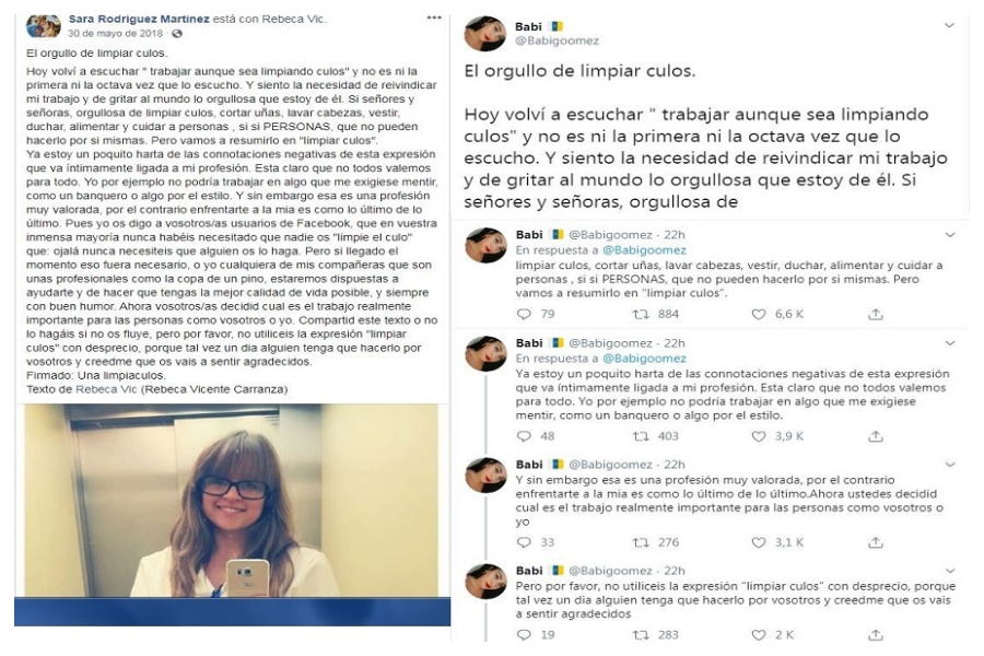 Successivamente, il tweet è diventato virale e molte persone hanno supportato la ragazza e cogliendo anche l’occasione per ringraziare tutti gli assistenti che come lei si prendono cura dei propri cari. Su Facebook un’altra donna di nome Sara Rodriguez Martinez pubblica una sua foto con la didascalia scritta da una sua amica. Il post inizia con la frase di Babi e continua: “… ma riassumiamolo come “pulizia dei culi”. Sono già un po’ stufa dei connotati negativi di questa espressione che è strettamente legata alla mia professione. È chiaro che non tutti siamo bravi in tutto. Ad esempio, non potevo lavorare in qualcosa che mi richiedesse di mentire, come un banchiere o qualcosa del genere. Eppure quella è una professione molto apprezzata, al contrario affrontare la mia è come l’ultima delle ultime. Beh, io dico a voi / e utenti di Facebook, che nella vostra grande maggioranza non avete mai avuto bisogno che nessuno vi “pulisca il culo” e spero che non abbiate mai bisogno di qualcuno ve lo faccia. Ma dico alla maggior parte di coloro che ci classificano in quel modo che se arriverà il momento necessario, io o i miei colleghi professionisti saremo disposti ad aiutarvi e farvi avere la migliore qualità di vita possibile, sempre con buon umore e amore. Ora decidete voi qual è il lavoro davvero importante per le persone come me o voi ma per favore, non usate l’espressione “culi puliti” con disprezzo, perché forse un giorno qualcuno dovrà farlo per voi e credetemi che ne sarete grati. Firmato: una pulita“.