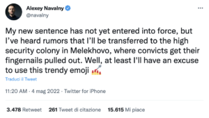 “L’ultima sentenza nei miei confronti non è ancora esecutiva ma ho sentito voci che sarò trasferito nel carcere di massima sicurezza di Melekhovo, dove ai detenuti vengono strappate le unghie“. L’oppositore russo Alexey Navalny, attualmente in carcere, ha fatto sapere tramite un tweet quale potrebbe essere la sua prossima destinazione. Senza rinunciare a una nota di sarcasmo, come spesso usa fare: “Bene, almeno avrò una scusa per usare questa emoji alla moda“, scrive aggiungendo il simbolo che ritrae delle unghie colorate di rosso.