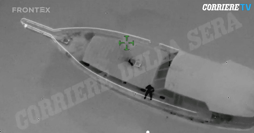 Un video che pare cristallizzare la situazione di pericolo in cui si trovava l’imbarcazione che non è stata soccorsa dalla Guardia Costiera. Anzi, è stata avviata una operazione di polizia con l’entrata in azione della Guardia di Finanza. Nel filmato di Frontex, si vede prima una ‘macchia’ presente in mare, poi l’obiettivo della camera ingrandisce la ‘macchia’ e scova la barca che naviga con rotta 296° (verso Nord Ovest) e procede a una velocità di 6 nodi.