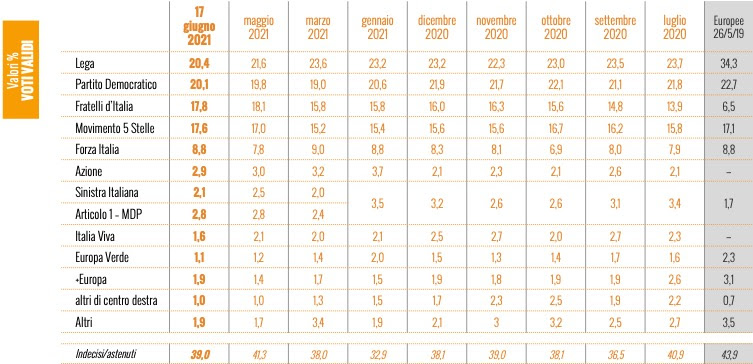 La Lega è infatti ancora la prima forza, al 20,4% dell’indice di gradimento, in netto calo di 1,2 punti rispetto alla rilevazione di maggio. Salgono invece i dem, dal 19,8% di un mese fa all’attuale 20,1%. Come detto, Fratelli d’Italia si trova sul terzo gradino del podio, e anzi risulta in calo rispetto all’ultima analisi: gli attuali 17,8 punti di gradimento sono meno del 18,1% di un mese fa.