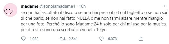 Madame non si è neanche disturbata a replicare agli influencer che la polemica l’hanno cavalcata alimentando insulti e offese. “Io personalmente non l’avrei fatto”, ha osservato. Touché. E se confermerà le grandi aspettative che ha creato sulla sua carriera sarà attraverso la sua musica, non in virtù di un ricatto per la notorietà. Non lo dovrà mica a fan, sedicenti tali, ai ritrosi perfino che “se non era per noi, non eri nessuno” o che “adesso sei qualcuno, in futuro potrai non essere più nessuno”. Che magari l’ultimo disco lo hanno comprato quindici anni fa masterizzato in mezzo alla strada, o che “questi giovani, sempre su questi social, non si comunica più”.