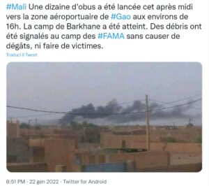 La base operativa avanzata di Gao, in Mali, è stata colpita ieri sera da colpi di mortaio da parte di forze ostili alla coalizione internazionale a guida francese, che opera in Sahel nell’ambito dell’operazione Barkhane.